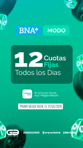 Promo BNA+ MODO Si tenés BNA+ MODO, aprovechá esta promo TODOS LOS DÍAS! Condiciones: 12 cuotas FIJAS Promo válida únicamente a través de la app BNA+ MODO Fecha límite: 31 de Mayo de 2026 Leé también: ¡Súper Miércoles con Santander!